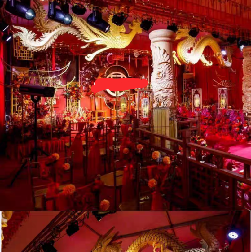 Ejderha Sütunu Köşkü Sahne Süslemesi, pratiklik ve sanatı birleştiren yüksek kaliteli bir heykeldir. Köpük el sanatlarının hafifliğini ve rahatlığını, oyma el sanatlarının zarif dokusuyla birleştirir. Ayrıca atmosferi güzelleştirmek ve uğurlu anlamlar taşımak için dekorasyonda tercih edilen bir aksesuardır. Temel bir düğün pervanesi olarak esas olarak düğün pervanesi senaryolarında uygulanır. Tek başına düğün salonu süsü olarak (tek ürün) veya düğün salonu süsünün bir parçası olarak (genel paket serisi) kullanılabilir; aynı zamanda tematik sahne dekorları ve sergi dekorları ihtiyaçlarını da karşılayabilir ve diğer etkinlik senaryolarında, manzaralı noktalardaki büyük ölçekli peyzaj heykel düzenlemelerinde vb. kullanılabilir.