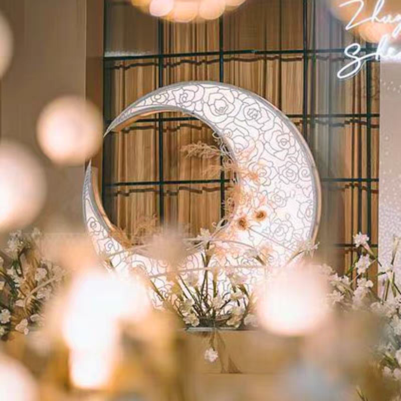 1.Dekorasyon Fonksiyonu: Her stilin kendine has özellikleri vardır - Aydınlık Ay sade ve zariftir, Demir Oymalı Ay zarif ayrıntılara sahiptir, Demir Yoğun Ay tam bir şekle sahiptir ve Intimate Lover stili içi boş çift yüz tasarımıyla romantik duyguları aktarır. Soğuk beyaz/sıcak beyaz ışık efektiyle birlikte atmosfer geceleri zenginleştirilir. 2. Uygulanabilir Senaryolar: Esas olarak düğün salonlarına uygulanabilir (tören sahne arka planı, karşılama alanı, her iki taraf) Pasajın), Düğün Romantik Tema Dekorasyon Aksesuarları ve Düğün sahne malzemeleri olarak görev yapar; hem dekoratif hem de atmosfer yaratma işlevleriyle üst düzey ziyafet dekorasyonu, düğün fotoğraf stüdyosu ayarı, ev oturma odası / avlu dekorasyonu, temalı parti düzenlemesi vb. için de kullanılabilir. 3.Pratik Avantajları: Demir malzeme ince işlenmiş, deforme edilmesi veya paslanması kolay değil; polikarbonat levha iyi ışık geçirgenliğine sahiptir, düzgün ve yumuşak ışık emisyonu sağlar; kurulumu kolaydır, doğrudan yerleştirilebilir veya basitçe sabit olup, çeşitli mekansal düzenlere uyum sağlar.